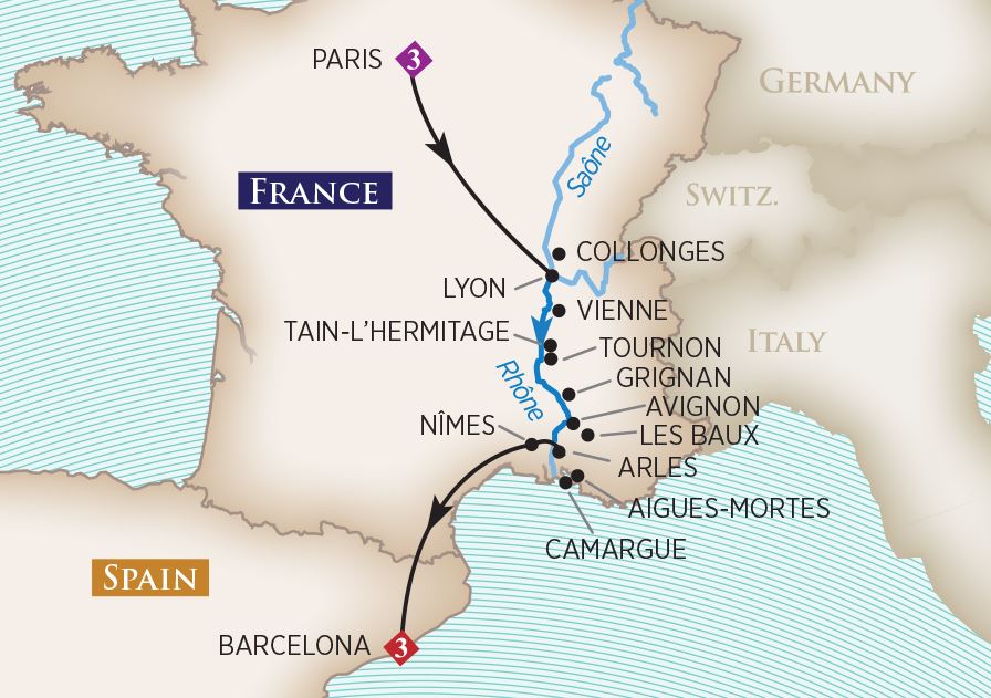 Check out of the hotel and board the TGV high-speed train to Nimes. Then you will transfer via bus to Arles where you’ll board your luxury ship. (B,D)